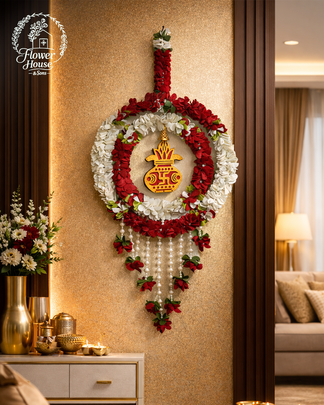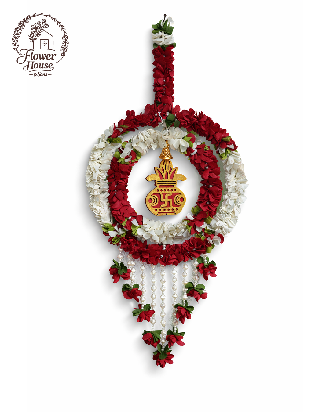 Elevate your home entrance with this stunning Diamond Ring Floral Hanging. This unique circular decor combines traditional floral beauty with a modern “Diamond Ring” shape, making it a perfect statement piece for any celebration.