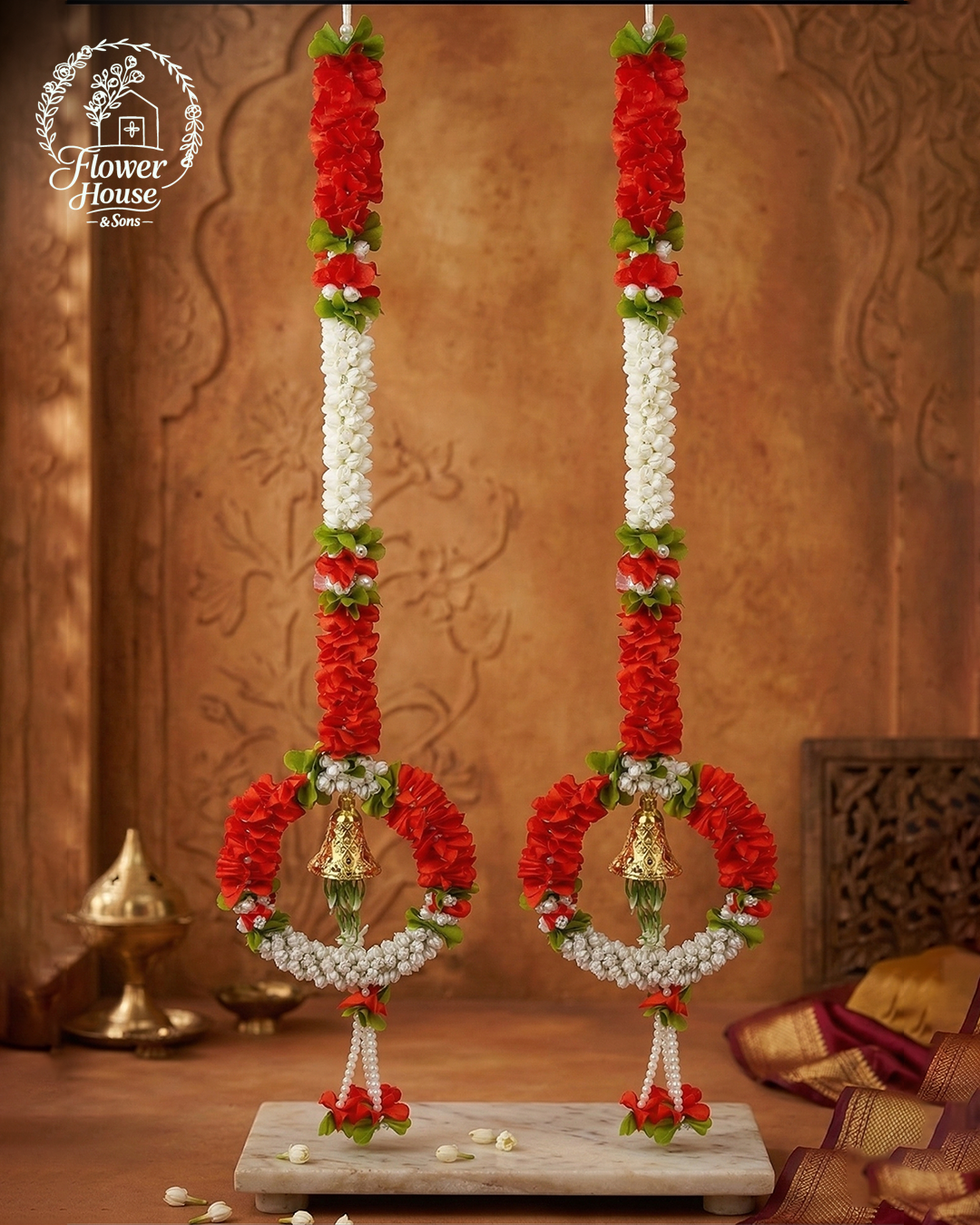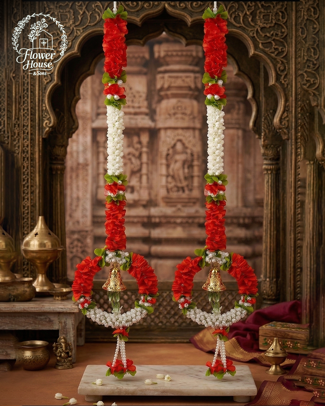 Elevate your home’s entrance with these handcrafted 3-foot floral hangings. Featuring a classic blend of Red and White flowers with a striking Golden Bell centerpiece, these torans bring a perfect mix of tradition and elegance to any space. Key Features: Vibrant Aesthetics: Realistic Red, White, and Green floral design inspired by Jasmine (Mogra) and Marigold. Elegant Craftsmanship: Each string ends in a beautiful circular wreath with a festive Golden Bell. Premium Quality: Made from high-grade, durable synthetic fiber that is dust-resistant and long-lasting. Perfect Fit: 3-foot length—ideal for main doors, puja rooms, and festive wall décor. Quick Specifications: Model: Ring…