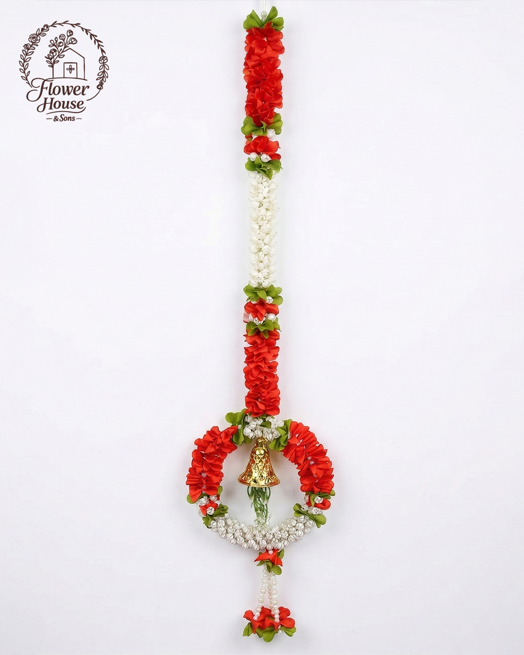 • Elegant Design: Features a long floral string leading to a circular wreath with a beautiful Golden Bell in the center.