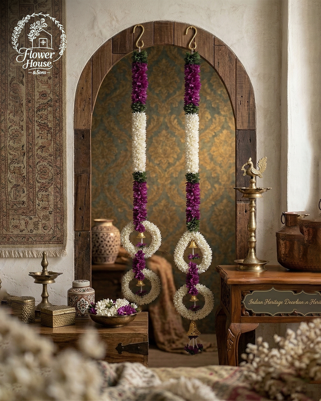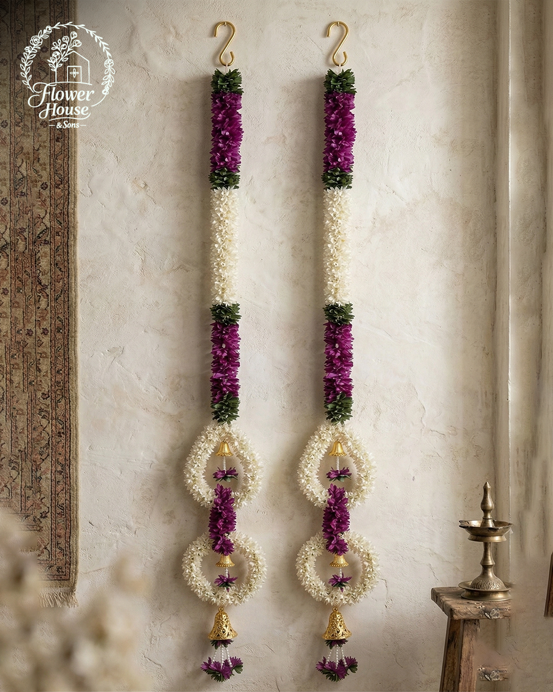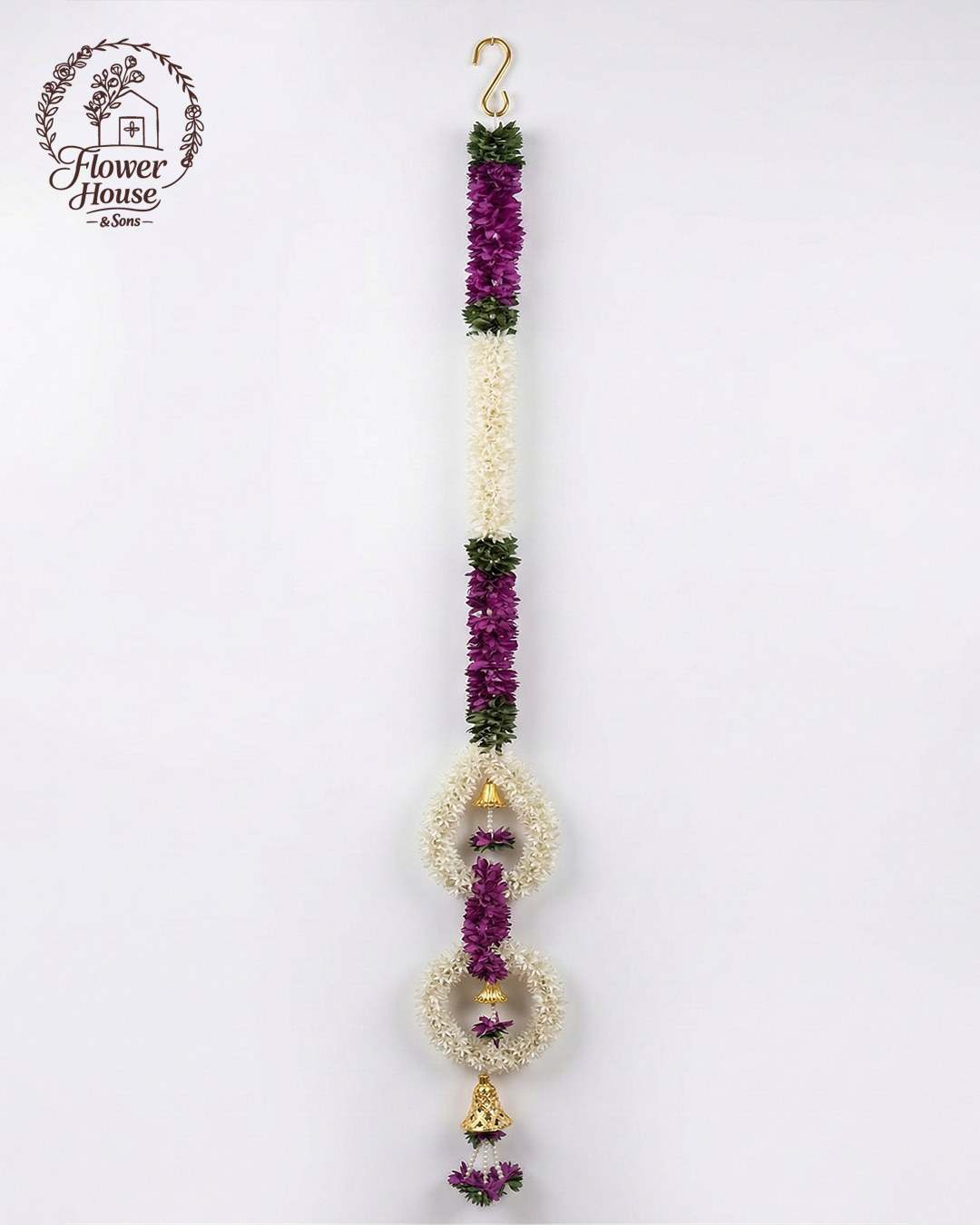 Add a touch of elegance to your home with the Ring No. R-803 handcrafted garlands. These 5-foot long decorative strings feature a unique alternating floral pattern and a festive bell finish, perfect for creating a high-end look at any entrance. Key Highlights: Rich Color Palette: A stunning combination of Deep Purple and Classic White blossoms with dark green leaf accents. Elegant Design: Features a vertical floral chain with integrated decorative rings and a Golden Bell (Ghungroo) finish at the bottom. Extra Long Reach: 5 Feet (150 cm) length—provides full, graceful coverage for main doors, walls, or wedding backdrops. Premium Quality:…
