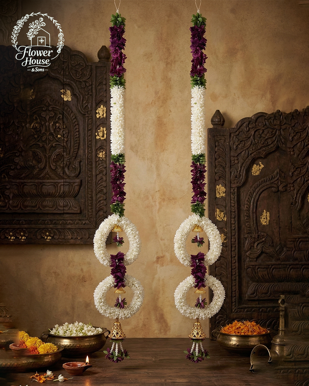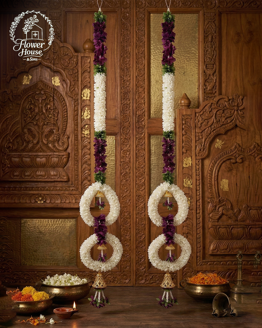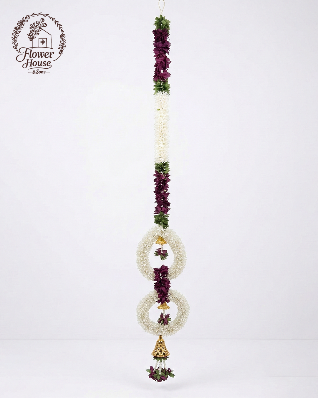 - Unique Design: Features two beautifully crafted white floral rings with hanging golden bells and maroon floral accents.