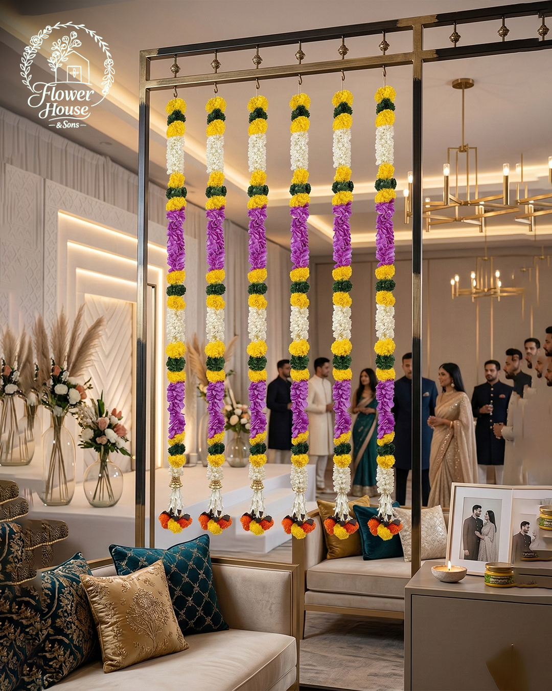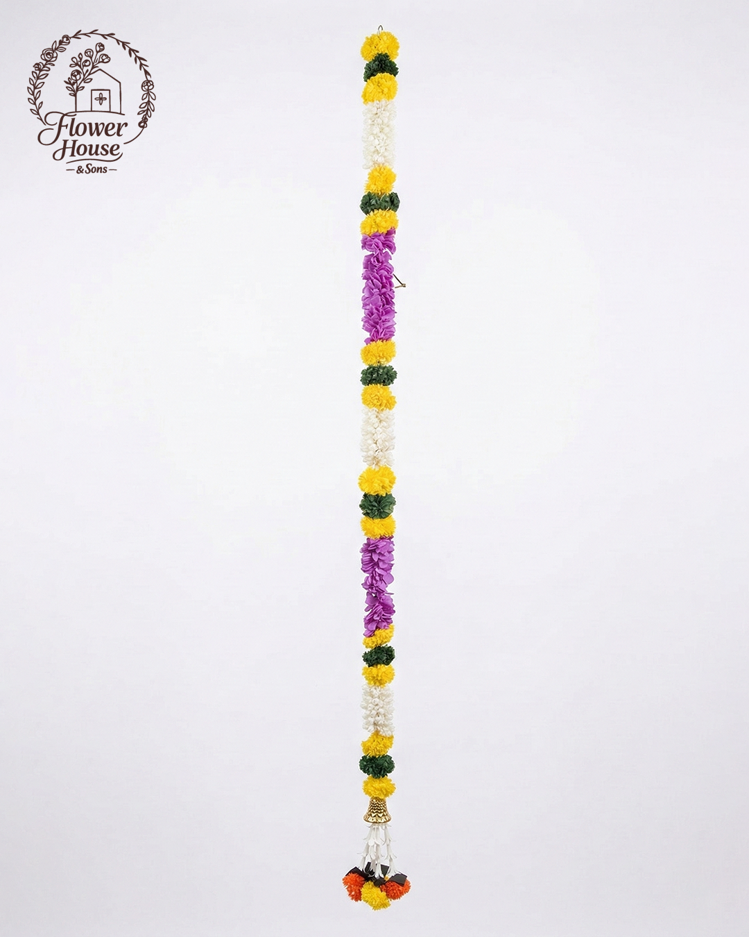 Brighten up your home with these vibrant and high-quality Gulsan artificial garlands. Designed for a realistic look with zero maintenance, these 5-foot long strings feature a beautiful sequence of colors that bring a traditional yet modern touch to any space. Product Highlights: Vibrant Color Pattern: A stunning sequence of Yellow, Dark Green, White, and Purple flowers for a bright and festive look. Elegant Tassel Finish: Each garland is finished with a traditional golden bell (ghungroo) and a unique multicolor tassel (Yellow, Orange, and Black). Perfect Size: The pack includes 6 pieces (5 feet each)—ideal for full-length door frames, wall backdrops,…