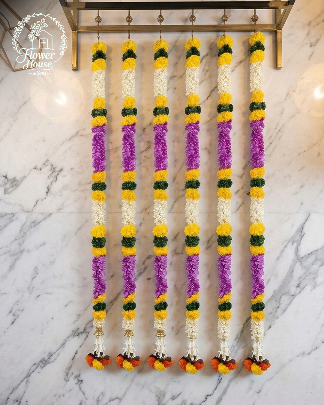 Enhance your home decor with these vibrant and high-quality artificial flower garlands. Specifically designed for festivals, weddings, and daily puja, these 5-foot (60-inch) garlands offer a realistic look with zero maintenance. Each piece is crafted with a beautiful sequence of colorful flowers to bring a traditional yet modern touch to your space.