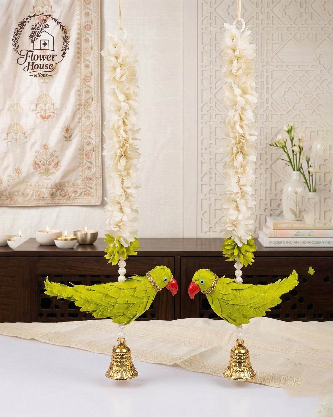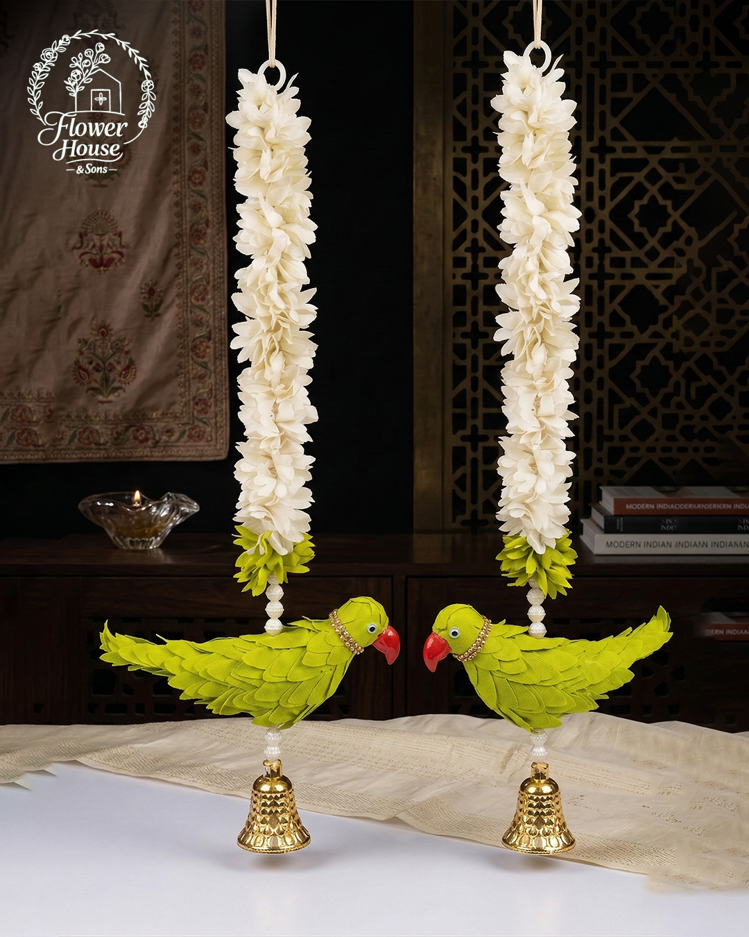 Add a touch of whimsical tradition to your home with these exquisite Parrot Latkans. Featuring a vibrant green parrot and a delicate jasmine garland, these 1-foot hangings are perfect for bringing a festive and artistic vibe to any space. Key Highlights: Charming Design: Features a detailed green parrot with a red beak, decorative stone necklace, and a metallic Golden Bell at the bottom. Authentic Craftsmanship: Hand-assembled with high-quality fabric and artificial White Jasmine (Mogra) flowers for a realistic look. Vibrant Color Palette: A striking combination of Bright Green, Pure White, and Golden accents. Perfect Size: 12 inches (1 Foot) length—ideal…