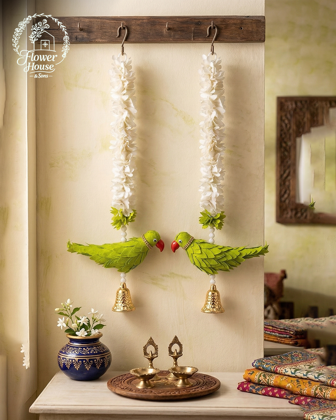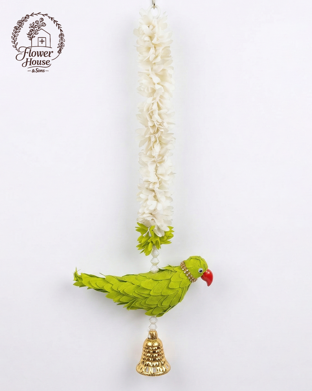 • Color: Green (Parrot), White (Flower Garland), and Gold (Bell).