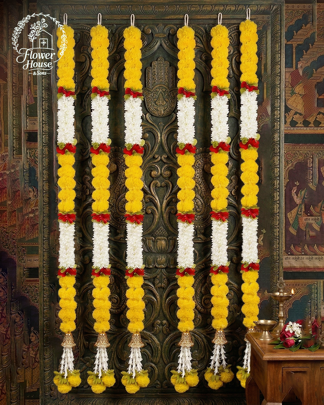 • Premium Design: A stunning mix of fluffy yellow Marigolds (Genda Phool) and elegant white Jasmine (Mogra) strings.