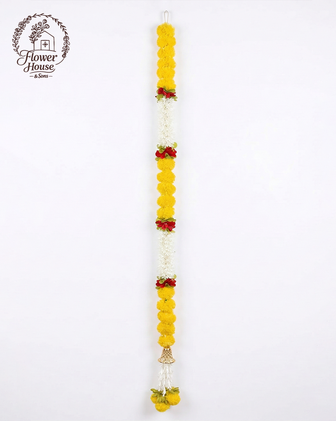 Add a touch of traditional elegance to your home with the Karishma Decorative Garland. This premium 5.5-foot hanging string is designed for a realistic look, blending vibrant festive colors with classic Indian elements. Key Highlights: Premium Floral Blend: A stunning mix of fluffy Yellow Marigolds (Genda) and elegant White Jasmine (Mogra). Detailed Accents: Features deep red spacers and is finished with a traditional Golden Bell and floral bunch at the bottom. Extra Long Reach: At 5.5 feet, these garlands are perfect for main doors, pillars, and high ceilings. Durable & Reusable: Crafted from high-quality synthetic fiber and plastic that stays…