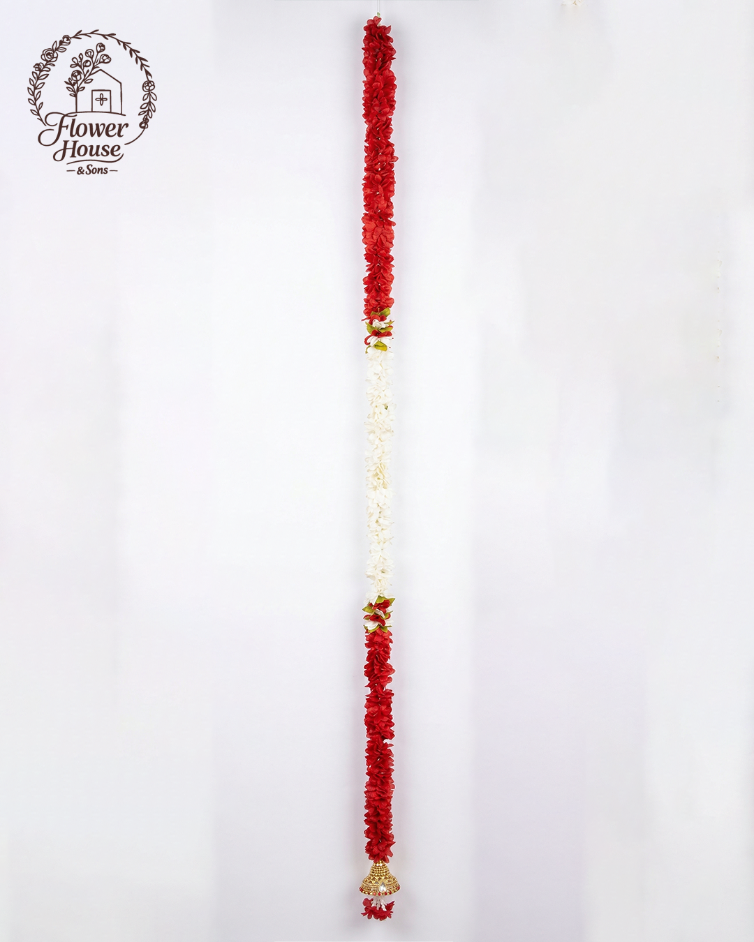 • Traditional Bell Finish: Each garland features a stunning golden Jhumka (Bell) at the bottom, decorated with pearls and red floral tassels.