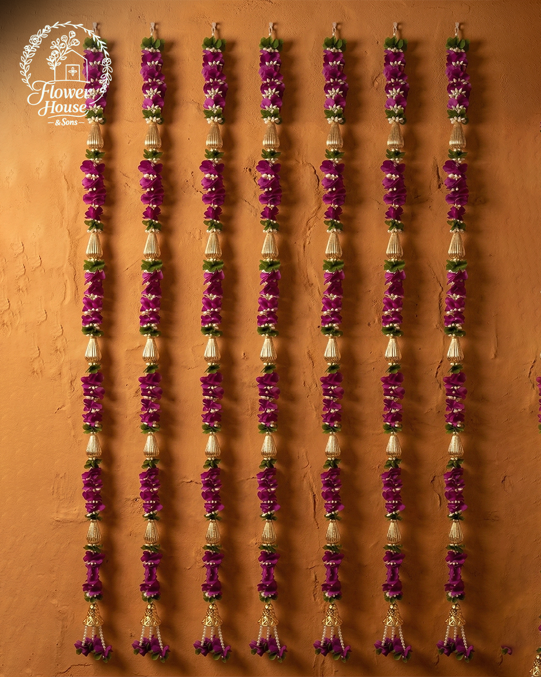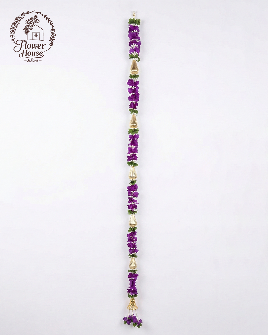 Elevate your home decor with these elegant, handcrafted artificial flower strings. Designed with a rich purple color and traditional gold accents, these 5-foot garlands are the perfect way to add a royal touch to your festivals, weddings, and everyday home styling.