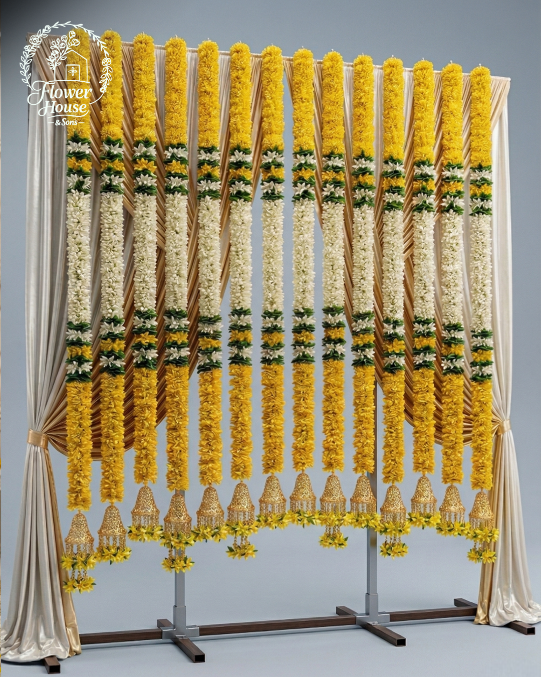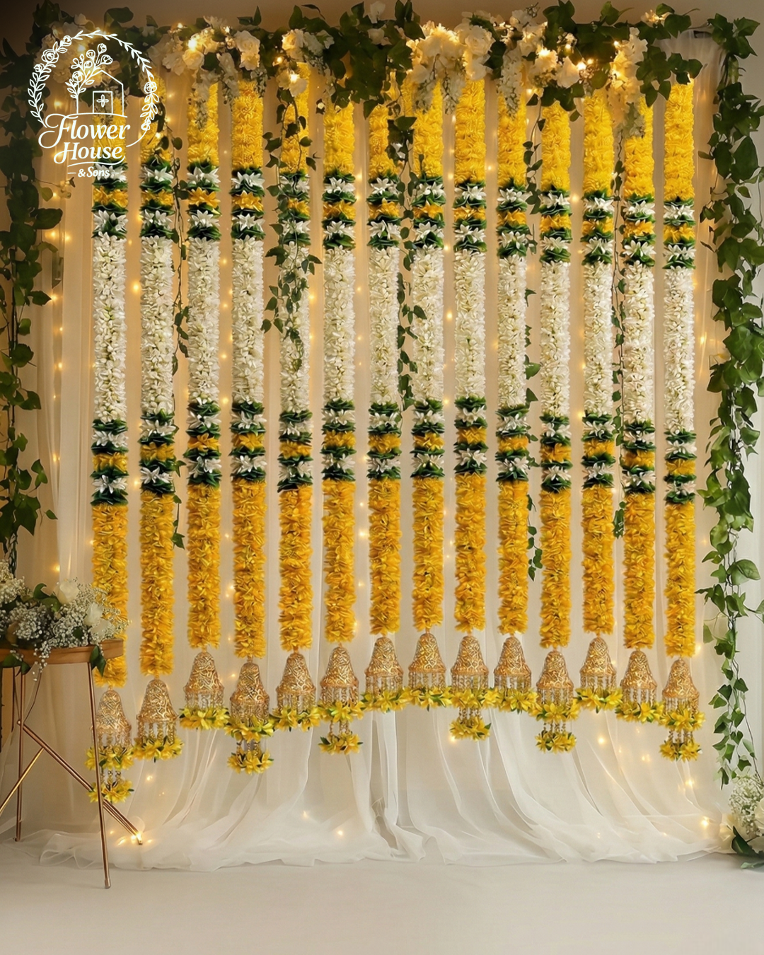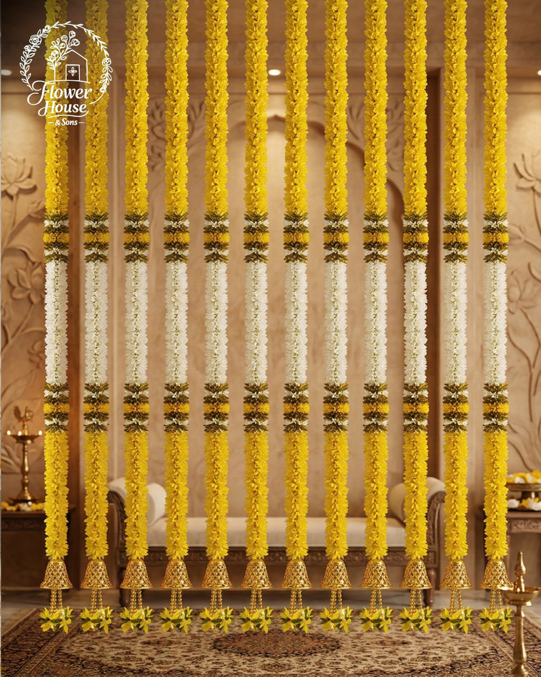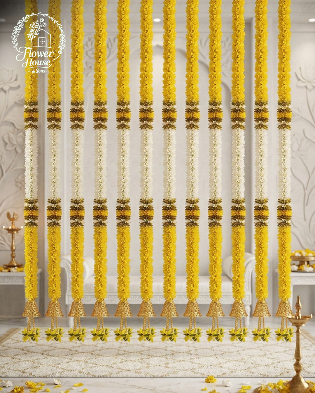 Make your home or wedding venue look stunning with the 2529 No. Flower Laddi. These handcrafted artificial flower strings are designed to bring a traditional and festive glow to any space. Featuring vibrant yellow blooms and elegant golden accents, they are the perfect choice for high-end decorations.